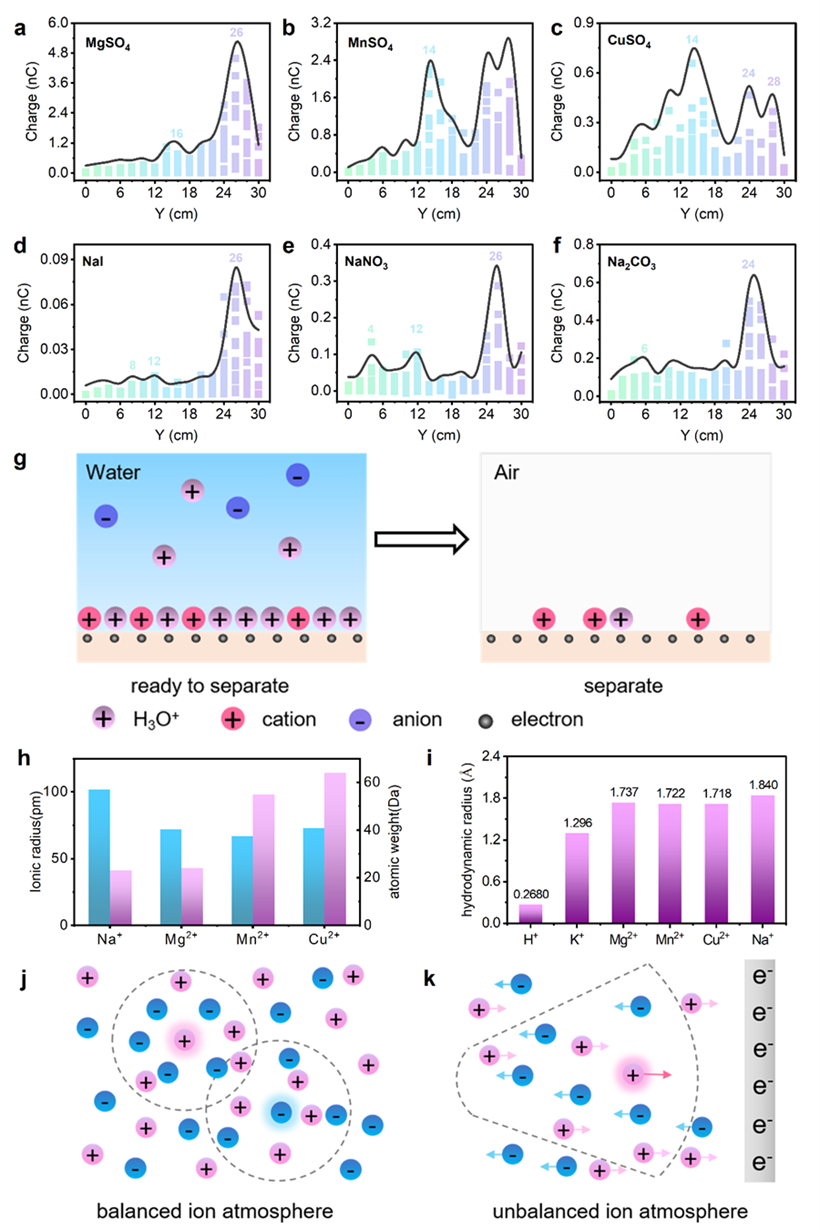 图2:液滴中阳离子和阴离子种类对特征TES的影响。 (a-c)具有相同阴离子的1M MgSO4、MnSO4 和 CuSO4 的TES; (d-f) 具有相同阳离子的1M NaI、NaNO3和Na2CO3 的TES; (g) FEP表面上阳离子竞争吸附和解吸的示意图;(h) 阳离子(包括Na+、Mg2+、Mn2+和Cu2+)的离子半径和原子质量; (i) 各种离子的流体动力学半径; (j-k)本体溶液(j)和带负电的固体界面(k)的中离子氛围。