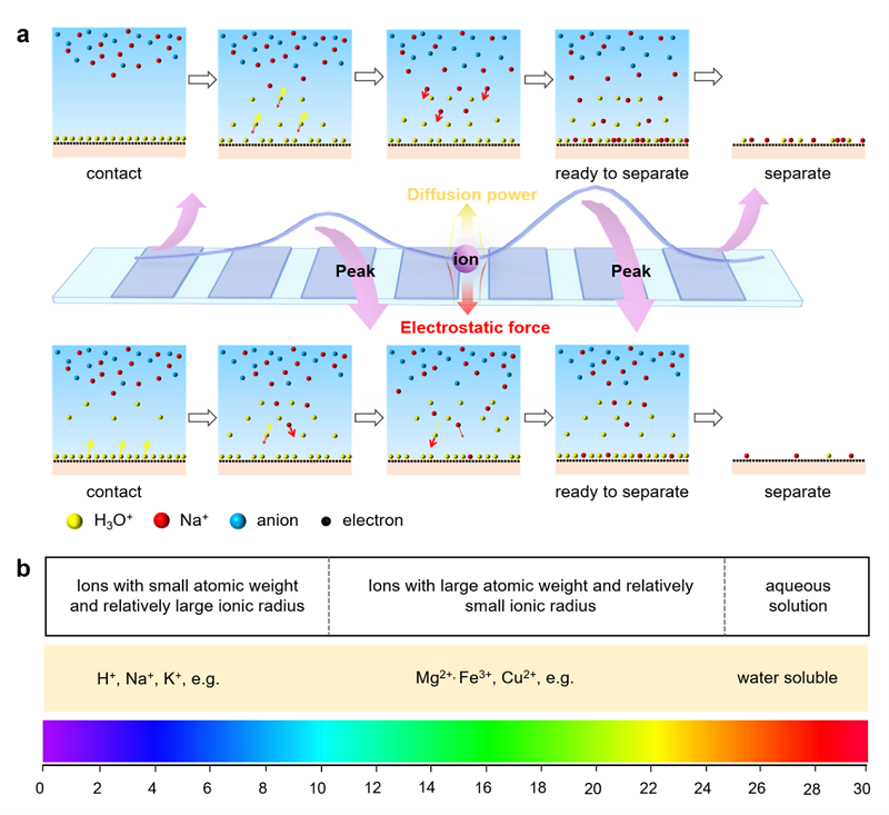 (a) TES离子识别工作原理:界面处离子竞争吸附和离子分布差异。 (b)TES中不同出峰位置处对应的离子。