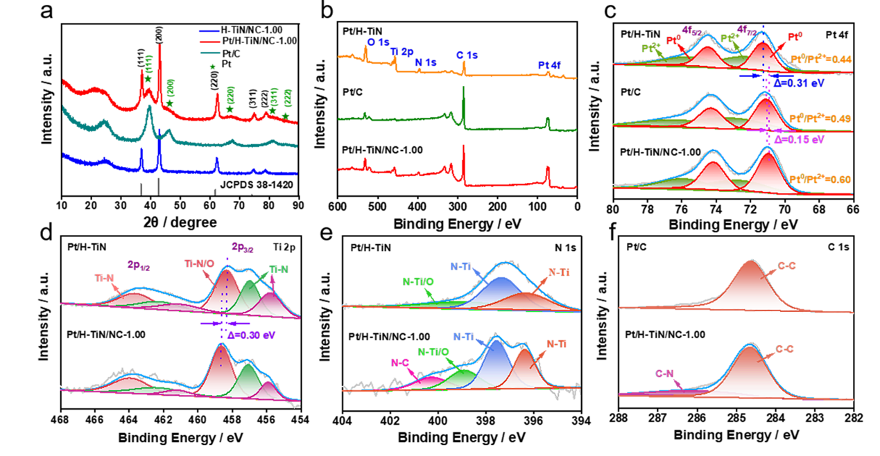 图3 (a)H-TiN/NC-1.00、Pt/H-TiN/NC-1.00和Pt/C的XRD谱图;(b)Pt/H-TiN/NC-1.00、Pt/H-TiN和Pt/C的XPS全谱;(c)Pt/H-TiN/NC-1.00、Pt/H-TiN和Pt/C的Pt 4f XPS谱图;(d)Pt/H-TiN/NC-1.00和Pt/H-TiN的Ti 2p XPS谱图和(e)N 1s XPS谱图;(f)Pt/H-TiN/NC-1.00和Pt/C的C 1s XPS谱图。