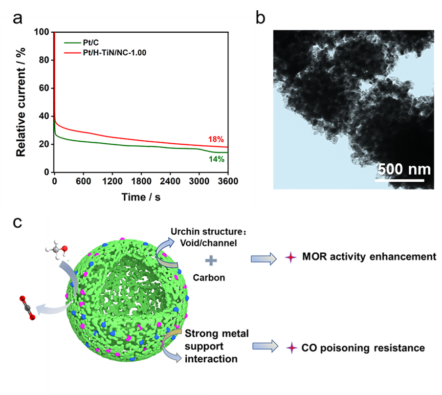 图6 (a)Pt/H-TiN/NC-1.00和Pt/C的I-t曲线;(b)Pt/H-TiN/NC-1.00耐久性测试后的TEM图像;(c)Pt/H-TiN/NC-1.00催化剂增强MOR活性的机理图。