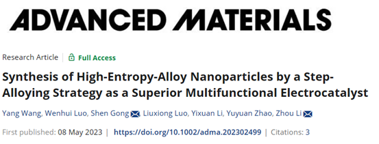 Yang Wang, Wenhui Luo, Shen Gong, Liuxiong Luo, Yixuan Li, Yuyuan Zhao, Zhou Li. Synthesis of High-Entropy Alloy Nanoparticles by Step-Alloying Strategy as Superior Multifunctional Electrocatalyst. Adv. Mater. 2023. DOI: 10.1002/adma.202302499.