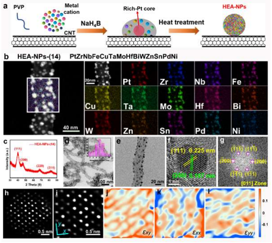 图1. (a) HEA-NPs的分步合金化策略合成过程示意图。(b) HEA-NPs-(14)的EDS元素映射。(c) HEA-NPs-(14)的XRD衍射。(d-e) HEA-NPs-(14)的TEM图。(f) HEA-NPs-(14)的高分辨率TEM图。(g) HEA-NPs-(14)的FFT衍射。(h-i) HEA-NPs-(14)的原子级分辨率HAADF-STEM图。(j-l)分别沿xy、xx和yy方向的应变映射。