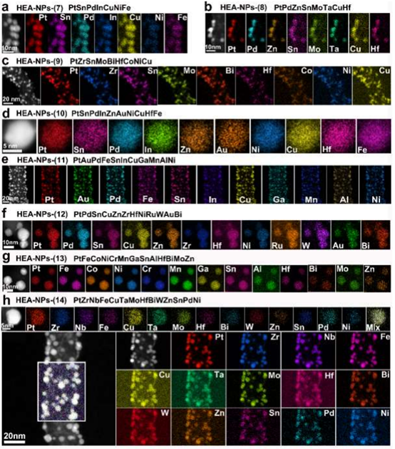 图2. (a) HEA-NPs-(7) (Pt, Sn, Pd, In, Cu, Ni和Fe),(b) HEA-NPs-(8) (Pt, Pd, Zn, Sn, Mo, Ta, Cu和Hf),(c) HEA-NPs-(9) (Pt, Zr, Sn, Mo, Bi, Hf, Co, Ni和Cu),(d) HEA-NPs-(10) (Pt, Sn, Pd, In, Zn, Au, Ni, Cu, Hf和Fe),(e) HEA-NPs-(11) (Pt, Au, Pd, Fe, Sn, In, Cu, Ga, Mn, Al和Ni),(f) HEA-NPs-(12) (Pt, Pd, Sn, Cu, Zn, Zr, Hf, Ni, Ru, W, Au和Bi),(g) HEA-NPs-(13) (Pt, Fe, Co, Ni, Cr, Mn, Ga, Sn, Al, Hf, Bi, Mo和Zn),(h) HEA-NPs-(14) (Pt, Zr, Nb, Fe, Cu, Ta, Mo, Hf, Bi, W, Zn, Sn, Pd和Ni)的HAADF和EDS元素映射图。