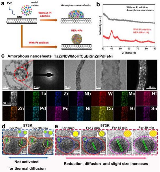 图3. (a) Pt在元素混合方面的促进作用示意图。(b)非晶纳米片和HEA-NPs-(14)的XRD衍射。(c)非晶纳米片的TEM图、SAED衍射、HAADF图、HR-TEM图和EDS元素映射。(d) HEA-NPs-(14)在热处理过程中的原位TEM图序列。