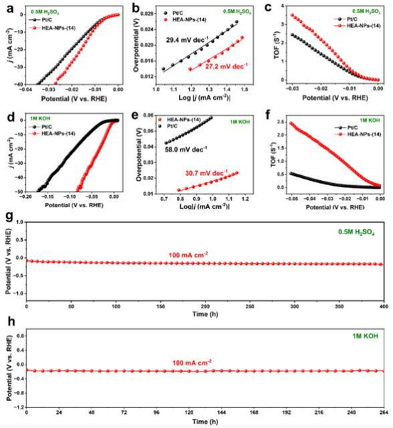 图4. 在0.5 M H2SO4和1 M KOH溶液中的电催化HER性能。HEA-NPs-(14)和商业Pt/C催化剂0.5 M H2SO4溶液中的(a)线性极化曲线,(b) Tafel曲线,(c) TOF曲线。HEA-NPs-(14)和商业Pt/C催化剂1 M KOH溶液中的(d)线性极化曲线,(e) Tafel曲线,(f) TOF曲线。(g) HEA-NPs-(14)在0.5 M H2SO4溶液和100 mA cm-2电流密度下的计时电位测试。(h) HEA-NPs-(14)在1 M KOH溶液和100 mA cm-2电流密度下的计时电位测试。