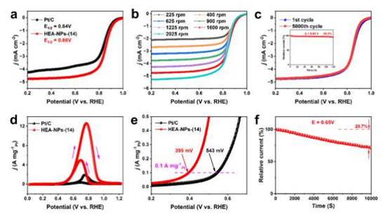 图6. 在0.1 M KOH溶液中的电催化ORR性能和在1 M KOH + 1 M MeOH溶液中的电催化MOR性能。(a) HEA-NPs-(14)和商业Pt/C催化剂在1600 rpm转速下的ORR极化曲线。(b) HEA-NPs-(14)在不同转速下的ORR极化曲线。(c) HEA-NPs-(14)在5000次循环前后的ORR极化曲线,插图为在0.65 V vs. RHE电位下运行120 h的计时电流测试。(d) HEA-NPs-(14)和商业Pt/C催化剂的循环伏安曲线。(e) HEA-NPs-(14)和商业Pt/C催化剂的起始电位(0.1 A mg-1Pt)。(f)在0.65 V vs. RHE电位下MOR反应的计时电流测试。