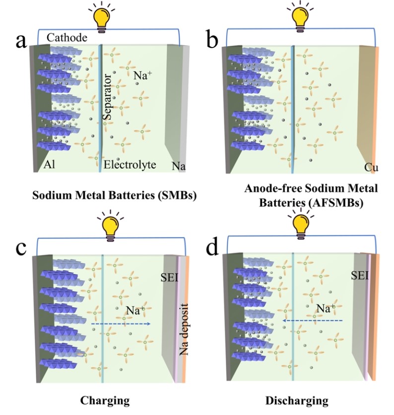 无负极钠金属电池(AFSMBs)作为一种新型电池结构,由于其具有理论能量密度高、安全性高、节省成本和制造工艺简单等优点,在大规模储能系统和便携式电子设备领域显示出巨大潜力。然而,由于库伦效率低、金属枝晶生长和固态电解质(SEI)不稳定等原因,无负极钠金属电池的循环寿命较短,这阻碍了其实际应用。