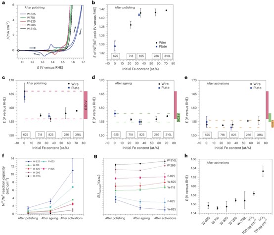 图1 0.1 M KOH, 25℃条件下OER性能的电化学表征。a,抛光后不同合金的CV扫描;b,从图1a中提取的Ni III /Ni II还原峰电位,作为扫描电子显微镜(SEM)和EDS测定的初始Fe含量的函数;c – e,抛光(c),时效(d)和激活(e)后导线和板的OER电位;f、抛光、时效和活化后各级Ni III /Ni II反应能力的演变;g、Ni活性位点性能的演化;h,电流密度为10ma cm−2时的OER电位。©2024 Springer Nature