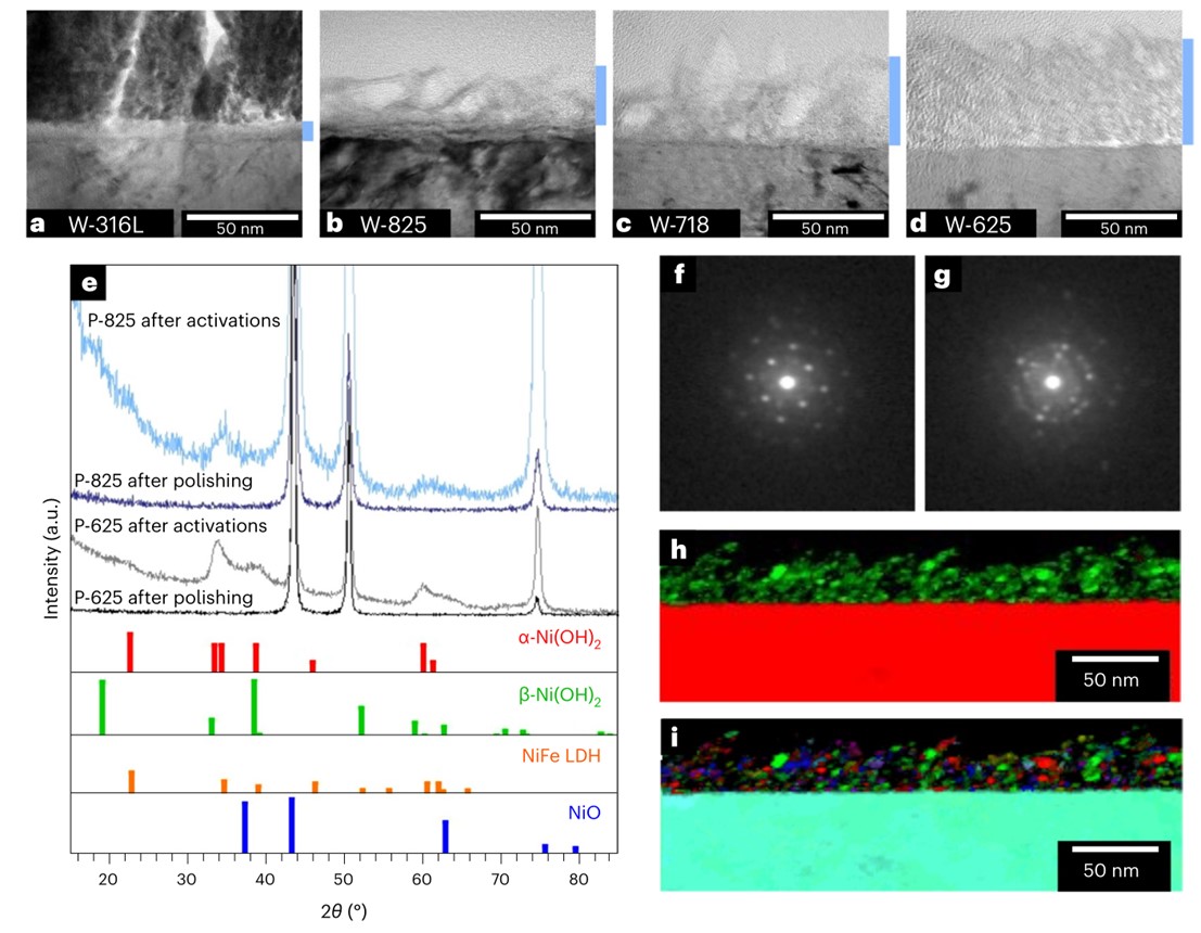 图2 Ni/Fe活性表面层微观结构表征。a – d四个样品的TEM图像:W-316L (a), W-825 (b), W-718 (c)和W-625 (d);每张图像右侧的蓝色区域勾勒出活性表面层;e, P-625和P-825抛光后和活化后的GI-XRD分析;f,g,活性表层中的衍射图,表明其具有良好结晶结构(f)和纳米晶结构(g);h,通过将衍射图与奥氏体相和NiO立方结构进行比较而生成的ASTAR相图; i, ASTAR晶体取向图. ©2024 Springer Nature