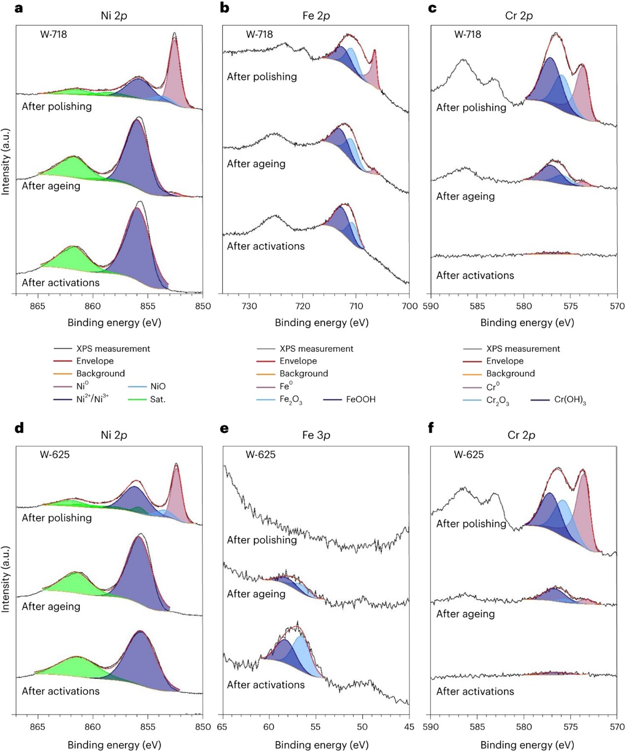 图4 Ni、Fe和Cr峰的XPS光谱反褶积。a – c为W-718的XPS分析:Ni2p (a)、Fe2p (b)和Cr2p (c);d – f为W-625的XPS分析:Ni2p (d)、Fe3p (e)和Cr2p (f)。©2024 Springer Nature