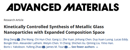 Bing Deng#,*, Zhe Wang#, Chi Hun Choi, Gang Li, Zhe Yuan, Jinhang Chen, Duy Xuan Luong, Lucas Eddy, Bongki Shin, Alexander Lathem, Weiyin Chen, Yi Cheng, Shichen Xu, Yimo Han, Boris I. Yakobson, Yufeng Zhao,* James M. Tour*, Kinetically Controlled Synthesis of Metallic Glass Nanoparticles with Expanded Phase Space, Advanced Materials, 2024, doi: 10.1002/adma.202309956.