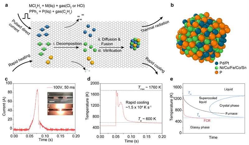 在此背景下,莱斯大学James Tour、清华大学邓兵和科尔万大学赵玉峰合作开发了一种闪光碳热反应(Flash Carbothermic Reaction)方法实现了Pd基和Pt基金属玻璃纳米颗粒的通用制备。首先在碳基底上负载金属前体,通过采用毫秒级电流脉冲,通过焦耳加热迅速将温度升至约1800 K(升温速率>105 K s-1),形成合金熔体,随后通过热辐射超快冷却(降温速率>104 K s-1)玻璃化成金属玻璃纳米颗粒。该方法可实现合成Pd和Pt基金属玻璃纳米颗粒的通用合成,包括PdNiP、PdCuP、PdCuNiP、PtCuP、PtCuNiP以及高熵PtPdCuNiP。进一步的,通过组合实验研究构建了PdNiP纳米颗粒的相图,并发现纳米尺度下的金属玻璃的组分空间相比块体金属玻璃大大扩展,这意味着纳米尺寸效应增强了其玻璃形成能力。结构模拟进一步揭示了纳米尺度和块体金属玻璃之间短程序差异。这种“纳米尺寸增强玻璃形成能力”效应使得一些从未在块体中实现的金属玻璃组分得以在纳米尺度合成,例如PdCoP、PdSnP和高熵PdCuFeNiP。此外,作者还展示了金属玻璃纳米颗粒在异质催化中的应用。