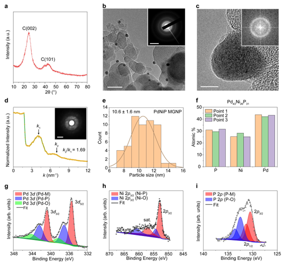 随后,作者采用了多种手段对金属玻璃纳米颗粒进行了表征,以证明其无定形原子结构(图2)。XRD显示其除了在~40°附近存在一个宽峰外,没有其他的结晶衍射峰。高分辨电子显微镜、电子衍射、纳米电子束衍射证明了其无定形的结构。合成的金属玻璃纳米颗粒的尺寸大约为10.6 nm,其平均组分为Pd43Ni26P31。进一步采用XPS研究了其电子结构,发现其存在各种化学键结构,包括Pd-Pd, Pd-Ni, Pd-P, Ni-P等,这可以归结于其无定形的原子结构导致了各种化学键的存在。