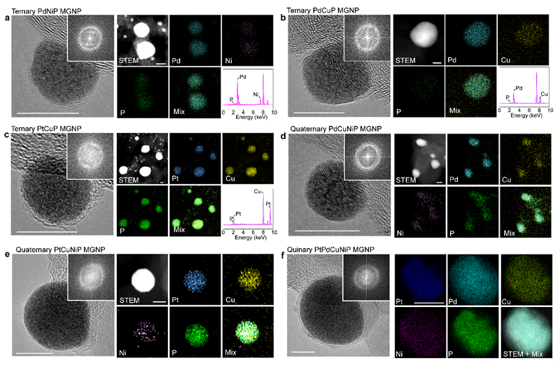 纳米尺寸效应增强玻璃形成能力的结论有两个重要的推论。首先,对于给定的合金体系,不能形成块体金属玻璃的组分比例可能在纳米尺度形成玻璃材料。对于自下而上的纳米尺度金属合成,对于块体金属玻璃的严格组分要求会减弱,正如作者合成具有广泛可调组成的Pd-Ni-P。其次,块体金属玻璃无法实现的合金体系可能在纳米尺度形成金属玻璃。基于这一点,作者进一步扩展了基于Pd的金属玻璃的组分空间,实现了Pd-Co-P和Pd-Sn-P金属玻璃纳米颗粒的合成(图5)。此外,作者还引入了Fe并合成了高熵PdCuNiFeP金属玻璃纳米颗粒。这些金属玻璃纳米颗粒的组成在块体中均尚未报道过。