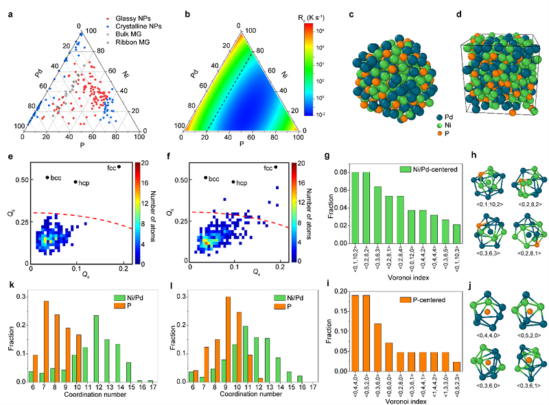 通过可调的前驱体负载和超快速合成,闪光碳热反应提供了广泛组分空间的金属玻璃的合成途径(图4)。通过组合实验,作者合成了数百个三元PdNiP金属玻璃纳米颗粒库,其相(晶体或玻璃态)和组成分别通过TEM和EDS确定。Pd-Ni-P相图显示约54%的纳米颗粒形成玻璃相,涵盖了约10至55 at%的P范围。相比之下,金属玻璃带和块状金属玻璃的组成接近P ~20 at%。因此,PdNiP 金属玻璃在纳米尺度上的组分空间比其块状对应物要大很多,即纳米尺寸效应增强了其玻璃形成能力。为了解释纳米尺寸和块体金属玻璃的结构差异,作者采用了分子动力学模拟来研究两者的形成。相比于块体金属玻璃,金属玻璃纳米颗粒显得更加“无序”,这可能是因为纳米颗粒具有更大的表面积,从而使得其原子更加无序化。这也是纳米尺寸金属玻璃具有更大的玻璃形成能力的起源。