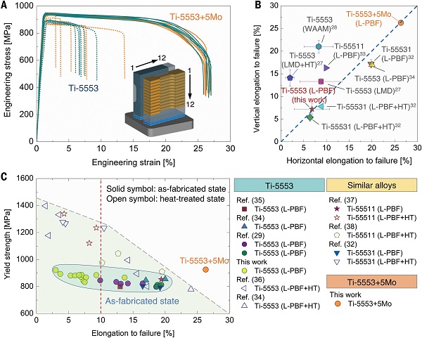 图2. L-PBF法制备Ti-5553和Ti-5553+5Mo的力学性能 © 2024 AAAS
