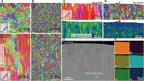 金属和合金的3D打印或增材制造(AM)通常涉及多种物理和冶金现象,这些现象在制造的产品中赋予复杂的微观结构和不同的机械性能。对于以立方晶体结构固化的金属合金,柱状晶粒通常在3D打印部件中占主导地位,因为具有容易生长<100>方向的晶粒倾向于与熔池的最大温度梯度紧密对准,并从部分熔化的层外延生长。尽管这种高度织构化的柱状晶粒结构对某些应用是有益的,但在大多数情况下它会降低机械性能并导致机械性能各向异性。更复杂的是,包括钛合金在内的许多同素异形合金系统也容易受到与3D打印过程中经历的固态热循环相关的相的不均匀分布的影响,使得实现均匀和优异的机械性能合金变得极具挑战性。