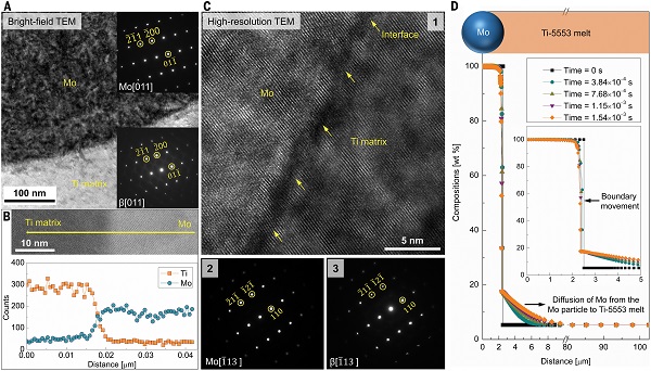 图4. Mo颗粒与钛基体界面的TEM表征和DICTRA模拟 © 2024 AAAS