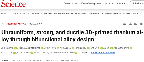 原文详情:Ultrauniform, strong, and ductile 3D-printed titanium alloy through bifunctional alloy design (Science, 2024, 383, 639-645)