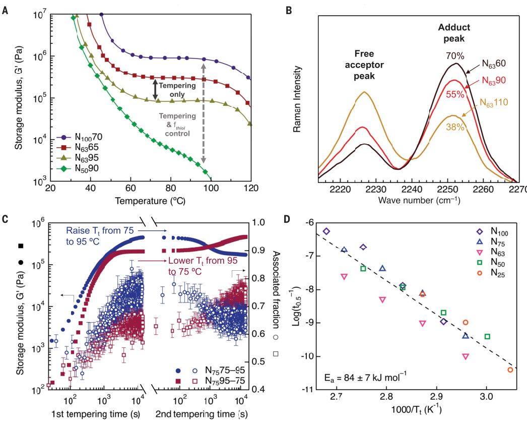 研究者结合可重构键的存在、动态键在回火窗口内的热敏性,以及室温下回火性能的稳定性,采用thia-Michael网络作为探索合成材料回火的原型系统。考虑到N63的室温操作窗口和较大的G′(温度相关存储模量)变化,作者选择N63来进一步研究NxY薄膜回火的潜在机制。实验证明了在特定操作温度下(本研究为室温)回火机械性能的能力,即在不进行何化学修饰的情况下轻松地在这些性能之间切换,并将回火性能保留一个多月。该研究近期发表在Science上,引起了不小的轰动。