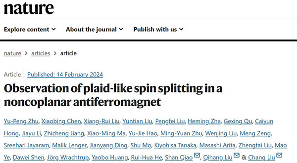 相关研究成果以“Observation of plaid-like spin splitting in a noncoplanar antiferromagnet”为题发表在Nature上。