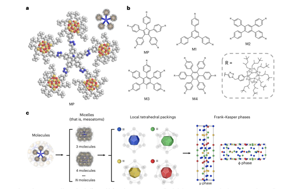 图2分子结构及多级组装示意图;(a) 分子五边形结构;(b) 分子五边形及分子1~4的核心及外围基团化学结构;(c) 分子五边形堆积成μ相和ϕ相的多级组装示意图;© Springer Nature Limited 2024