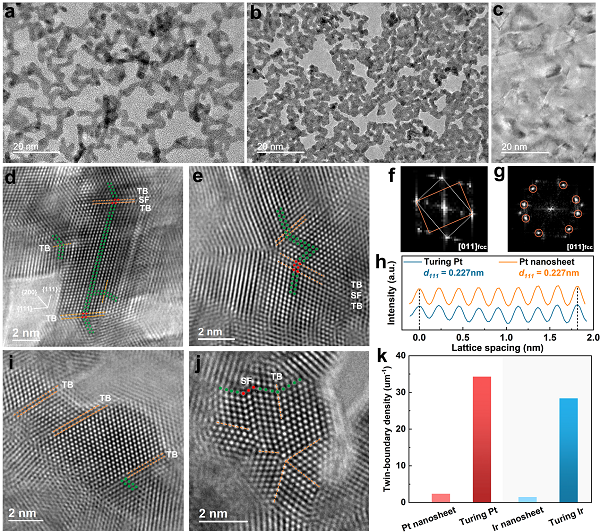 图2 (a) 图灵Pt纳米催化剂的TEM图;(b) 图灵Ir纳米催化剂的TEM图;(c) Pt纳米片的TEM图;(d) (e) 图灵Pt纳米催化剂中孪晶的HRTEM图;(f)(g) 纳米孪晶的傅里叶转变图;(h) 图灵Pt纳米催化剂和Pt纳米片的{111}面间距对比;(i) (j) 图灵Ir纳米催化剂中孪晶的HRTEM图;(k) 图灵Pt、Ir纳米催化剂中的孪晶密度。