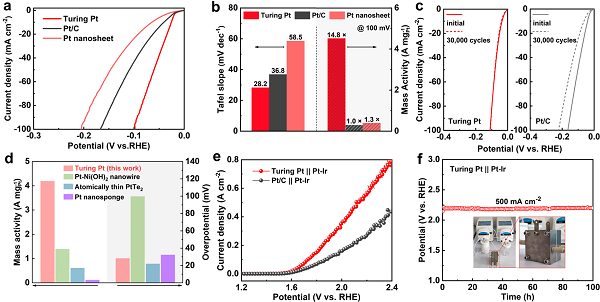 图4 (a) 图灵Pt纳米催化剂在1 M KOH溶液中的LSV曲线;(b) 塔菲尔曲线和质量活性对比图;(c)CV循环前后的LSV曲线对比;(d)质量活性和过电势对比图;(e)基于图灵Pt纳米催化剂的阴离子交换膜电解水槽的LSV曲线;(f) 基于图灵Pt纳米催化剂的阴离子交换膜电解水槽的稳定性测试曲线。