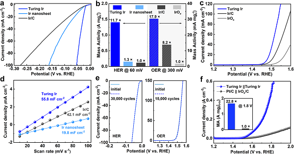 图5 (a) 图灵Ir纳米催化剂在1 M KOH溶液中的析氢反应LSV曲线;(b)HER质量活性和OER质量活性;(c) 图灵Ir纳米催化剂在1 M KOH溶液中的析氧反应LSV曲线;(d)电化学双电层电容;(e) 图灵Ir纳米网作为HER和OER催化剂在CV循环前后的LSV曲线对比;(f) 基于双功能图灵Ir纳米催化剂的阴离子交换膜电解水槽的LSV曲线。