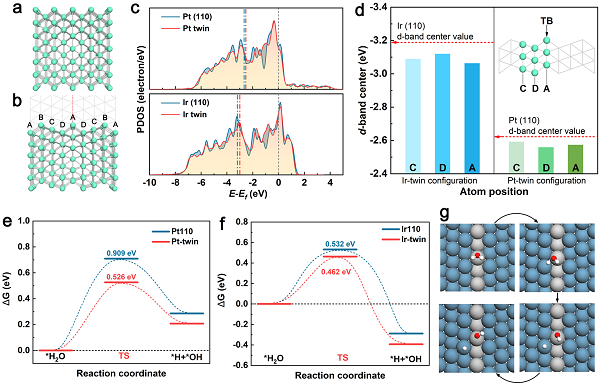 图6 (a)Pt/Ir (110)面的DFT计算模型;(b) Pt/Ir 孪晶的DFT计算模型;(c) Pt/Ir 孪晶的PDOS图;(d) 孪晶构型中不同原子阵列的d带中心;(e)水分解能垒对比;(f)水分子在Ir孪晶上分解过程的初始态、过渡态和最终态原子构型。