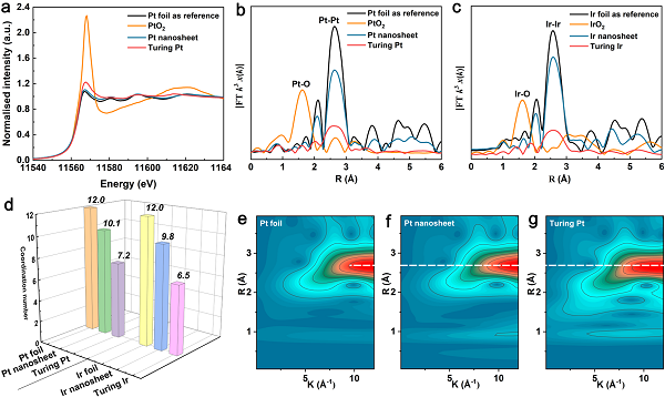 图3 (a) 图灵Pt纳米催化剂XANES图;(b) 图灵Pt纳米催化剂的EXAFS图;(c) 图灵Ir纳米催化剂的EXAFS图;(d) 图灵Pt、Ir纳米催化剂的配位数信息;小波变换图 (e)Pt foil、(f)Pt纳米片、(g) 图灵Pt纳米催化剂。