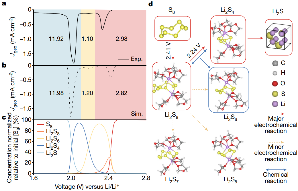 1.结合循环伏安法、原位拉曼光谱和密度功能理论计算,确定并直接描绘了不同电位下的关键中间体(S8、Li2S8、Li2S6、Li2S4和Li2S),并阐明了它们的转化途径。主要观察到Li2S4和Li2S6,其中Li2S4是决定整个SRR动力学的关键电化学中间体。Li2S6通过比例(歧化)反应产生(消耗),不直接参与电化学反应,但对多硫化物穿梭过程有重要贡献。