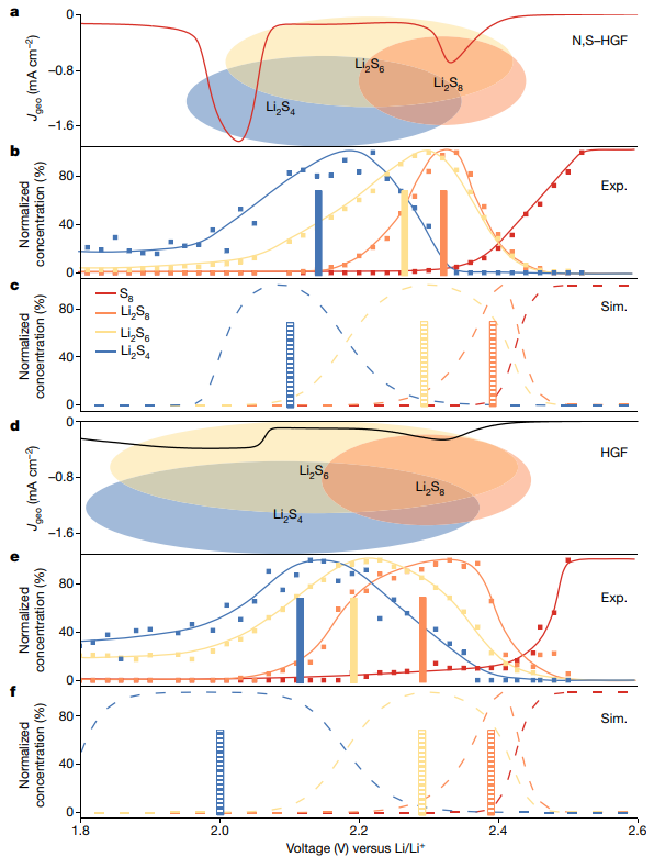 结合实验和理论研究,能够对16个电子的分为两个阶段的硫还原反应(SRR)建立复杂的反应网络,连接两个阶段最重要的中间体Li2S4。研究表明,Li2S4和Li2S6是SRR反应的主要中间体,其中Li2S4是控制SRR反应动力学的关键中间体,特别是在反应较缓慢的第二还原阶段;Li2S6由Li2S8和Li2S4之间的歧化反应生成,不直接参与电化学反应,但由于其在电解质中的高溶解度和能量上有利的积累,对穿梭效应有显著贡献。发现优化的N,S-HGF电催化电极显著加速了高阶LiPS的转化,导致在更高的电位范围下可溶性LiPS的更快耗尽,从而减轻了多硫化物穿梭效应并提高了输出电位。这项研究为改进的Li-S电池的电催化剂设计提供了有价值的见解。考虑到Li2S6的来源(Li2S8 + Li2S4 → 2 Li2S6),设计具有增强的Li2S8或Li2S4吸附的电催化剂可以抑制催化剂表面上的这些物质,从而抑制歧化反应并限制Li2S6的形成。此外,该方法可用于理解硫析出反应,以指导双功能硫催化剂的设计,用于加速SRR和硫析出反应过程,这对于开发耐用的Li-S电池至关重要。