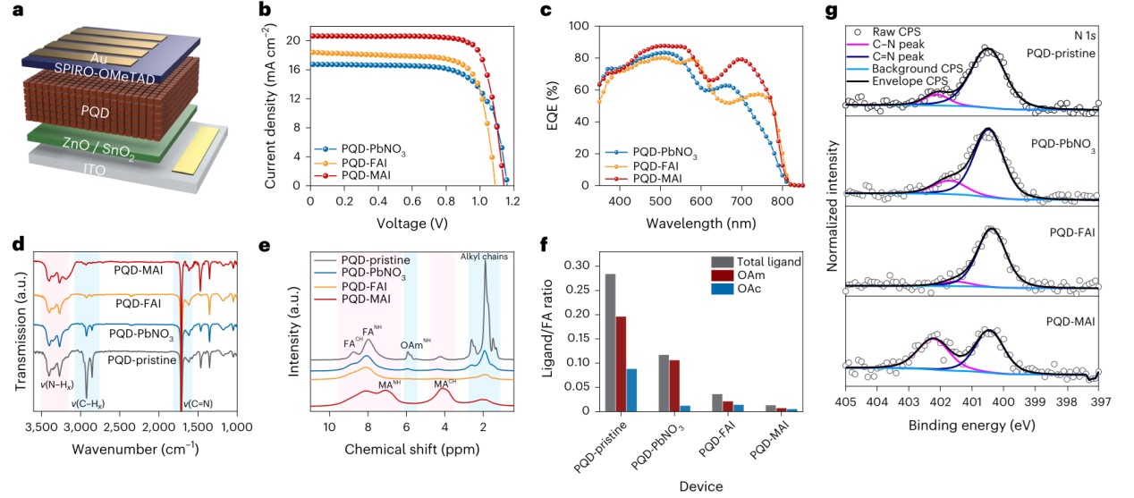 图1不同配体交换方式下PQD层的光伏性能和表面特征;a,本工作所采用的PQD太阳能电池器件架构;b, AM 1.5 G单太阳光照下PQD太阳能电池的J-V特性;c, PQD太阳能电池的EQE光谱;d、e、FTIR (d)和PQD (e)固体根据不同配体交换方法的固态1h – mas NMR谱; f, 1h – mas NMR计算的表面配体/FA比;g、对各种PQD膜进行反卷积的归一化n1s计数/秒(CPS)。©2024 Springer Nature