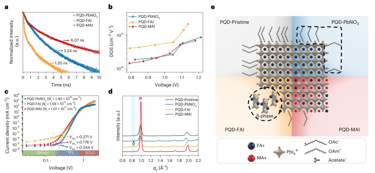 图2 不同配体交换方式对PQD阱态的影响;a, PQD薄膜的TRPL光谱;b,根据TPV/TPC测量计算的PQD太阳能电池中的DOS;c,各种PQD有源膜的电子器件的SCLC测量;d, GIWAXS光谱的面外1D图;e, 不同配体交换条件下的PQD晶体和表面示意图; ©2024 Springer Nature