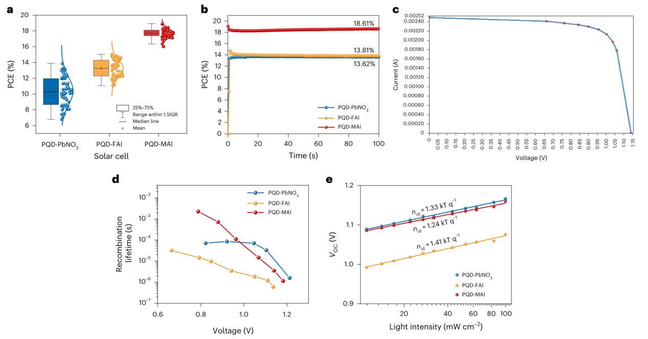 图3 PQD-MAI器件的太阳能电池性能; a、各种PQD太阳能电池的PCE统计; b, PQD太阳能电池在最大功率输出点的稳定稳定PCE; c,从认可的光伏测试实验室(Newport)获得的PQD-MAI器件的QSS J-V特性; d,在不同施加电压下,由TPV测量确定的器件的电荷重组寿命;e,不同光强下器件的实测VOC(圆),数据线性拟合(实线)及相应的理想因子(nid)。©2024 Springer Nature