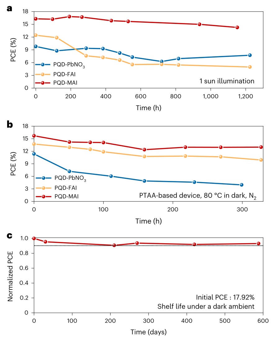 创造性采用碘化甲基铵(MAI)在异丙醇(IPA)中的配体交换策略,使PQD器件太阳能电池获得了18.1%的准稳态(QSS) PCE,同时兼具长期稳定性。