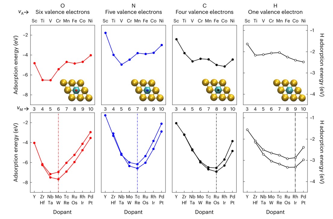 图1 |掺杂过渡金属单原子的Au基SAA表面原子吸附物(O, N, C, H)结合能的周期变化趋势;©2024 Springer Nature