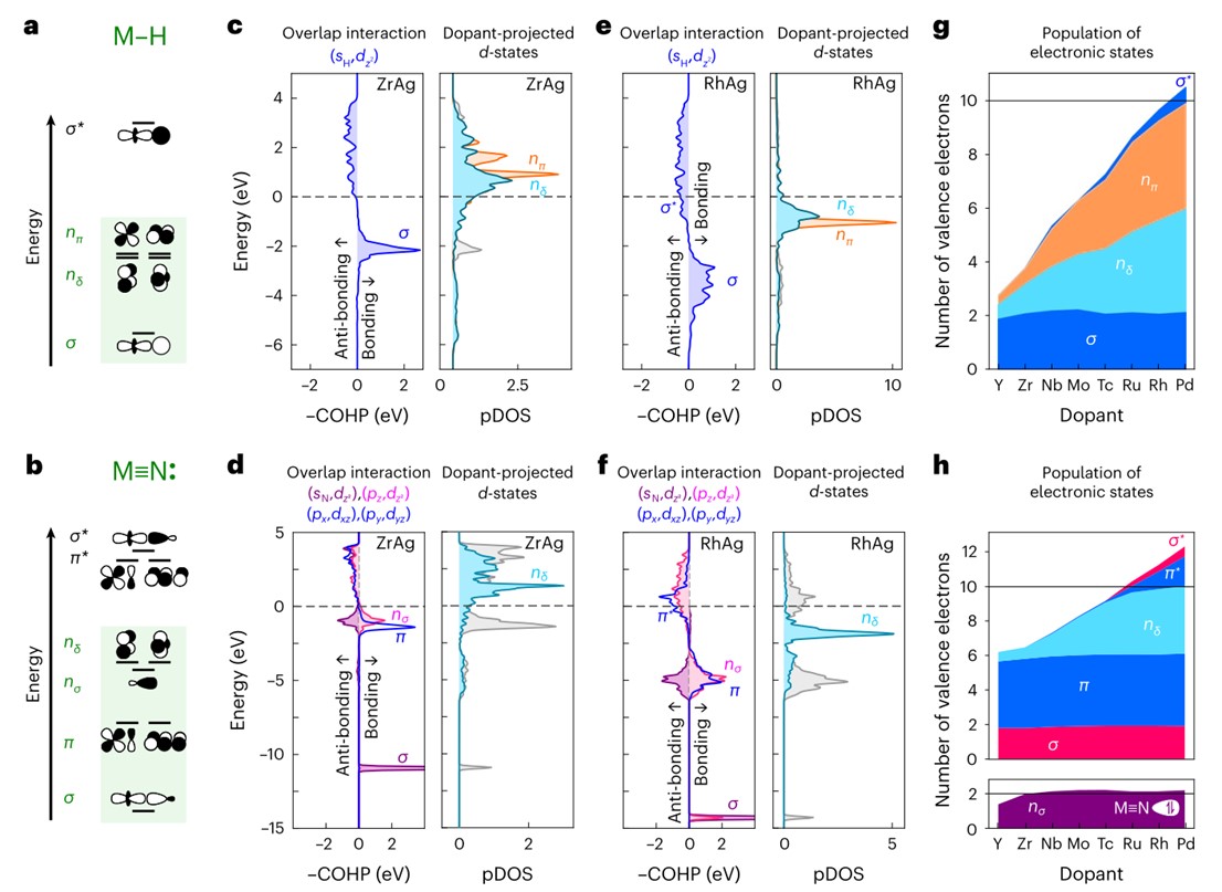 图2:双核配合物和SAA表面上与过渡金属结合的H和N的电子态比较;a,b,双核配合物MH (a)和MN (b)的MO图,其中M代表过渡金属。在掺杂Zr (c,d)和Rh (e,f)的Ag表面上对H (c,e)和N (d,f)进行COHP分析和pDOS分析;g,h,吸附在SAA表面的h (g)和N (h)电子态的全居族分析。当有d贡献的5个轨道被10个电子饱和时,反键态的占比变得显著。©2024 Springer Nature