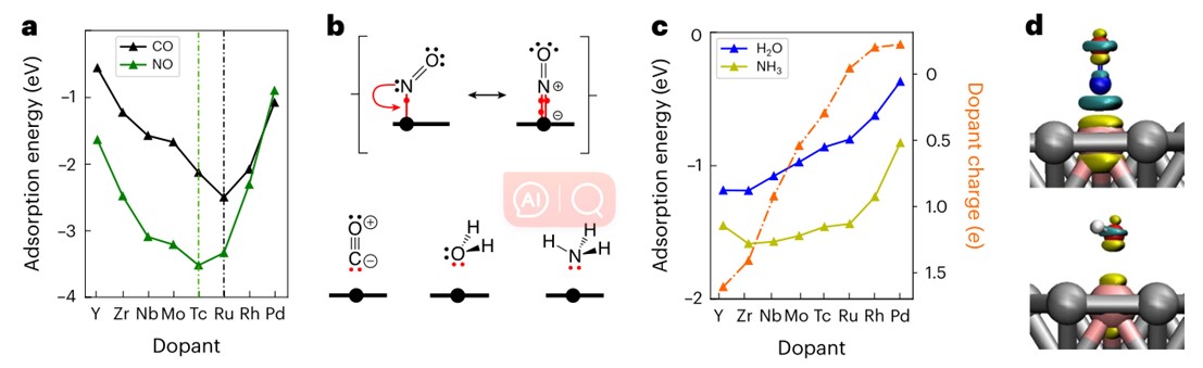 图3 分子在SAA表面的吸附;a, CO和NO的吸附能呈v型趋势,Tc (d 7)和Ru (d 8)的吸附能最小;b, CO和NO的路易斯结构(包括中散异构)表明,与掺杂剂直接相互作用的电子数(大黑球附近的红点代表掺杂剂)符合10个电子计数规则;c、尽管h2o和nh3与CO有相同数量的电子与掺杂剂直接作用,但其吸附能并不最小;d, NO(上表)和h2o(下表)的电子密度差,表示在RhAg SAA上吸附后电荷耗尽(黄色)和电荷积累(青色)(阈值为±0.06 e·Å−3)。©2024 Springer Nature