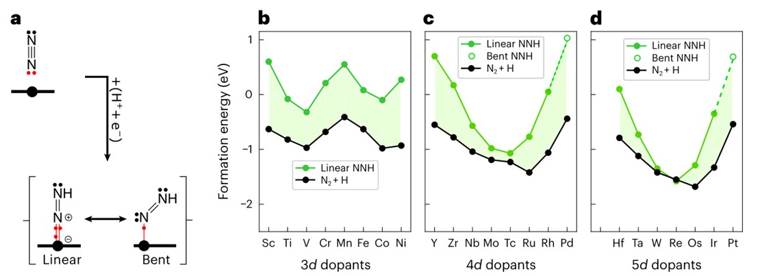 图4氮加氢生成二氮基NNH;a, NNH的Lewis结构和不同的结合模式;b – d,考虑3d (b)、4d (c)和5d (d)掺杂剂的au基SAAs上n2和NNH(不同几何形状)的生成能。©2024 Springer Nature