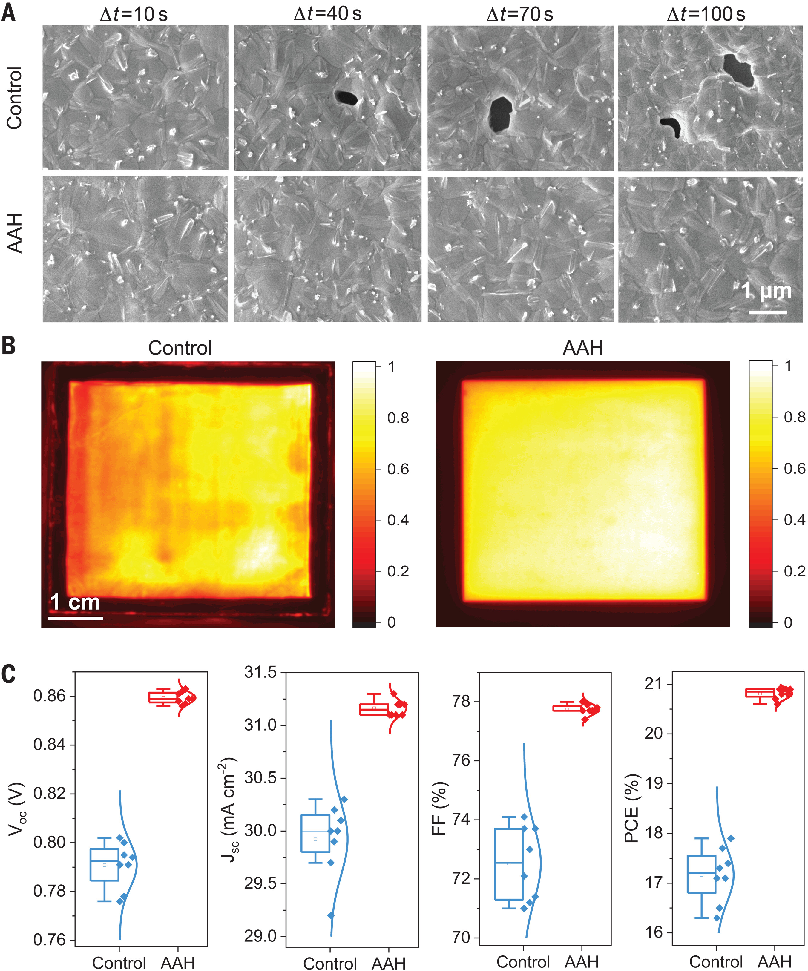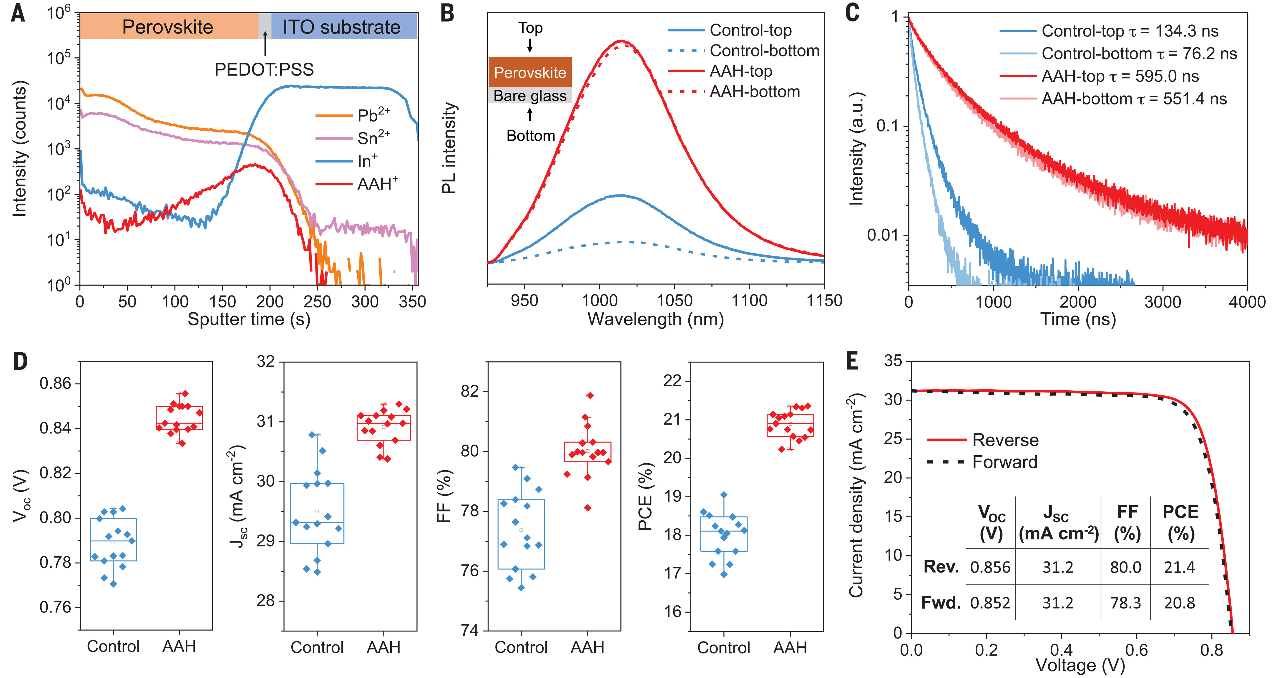 基于以上研究背景,南京大学谭海仁教授(通讯作者)等人通过引入 Good’s 生化缓冲剂的一种掺杂剂(氨基乙酰胺盐酸盐,AAH)来均匀钙钛矿的结晶,扩展了刮涂Pb-Sn钙钛矿薄膜的加工窗口,选择性钝化了钙钛矿的界面缺陷。实现了大面积(20.25 cm2)全钙钛矿串联太阳能电池组件24.5%的高PCE效率。相关研究成果以“Homogeneous crystallization and buried interface passivation for perovskite tandem solar modules”为题发表在最新Science期刊上。