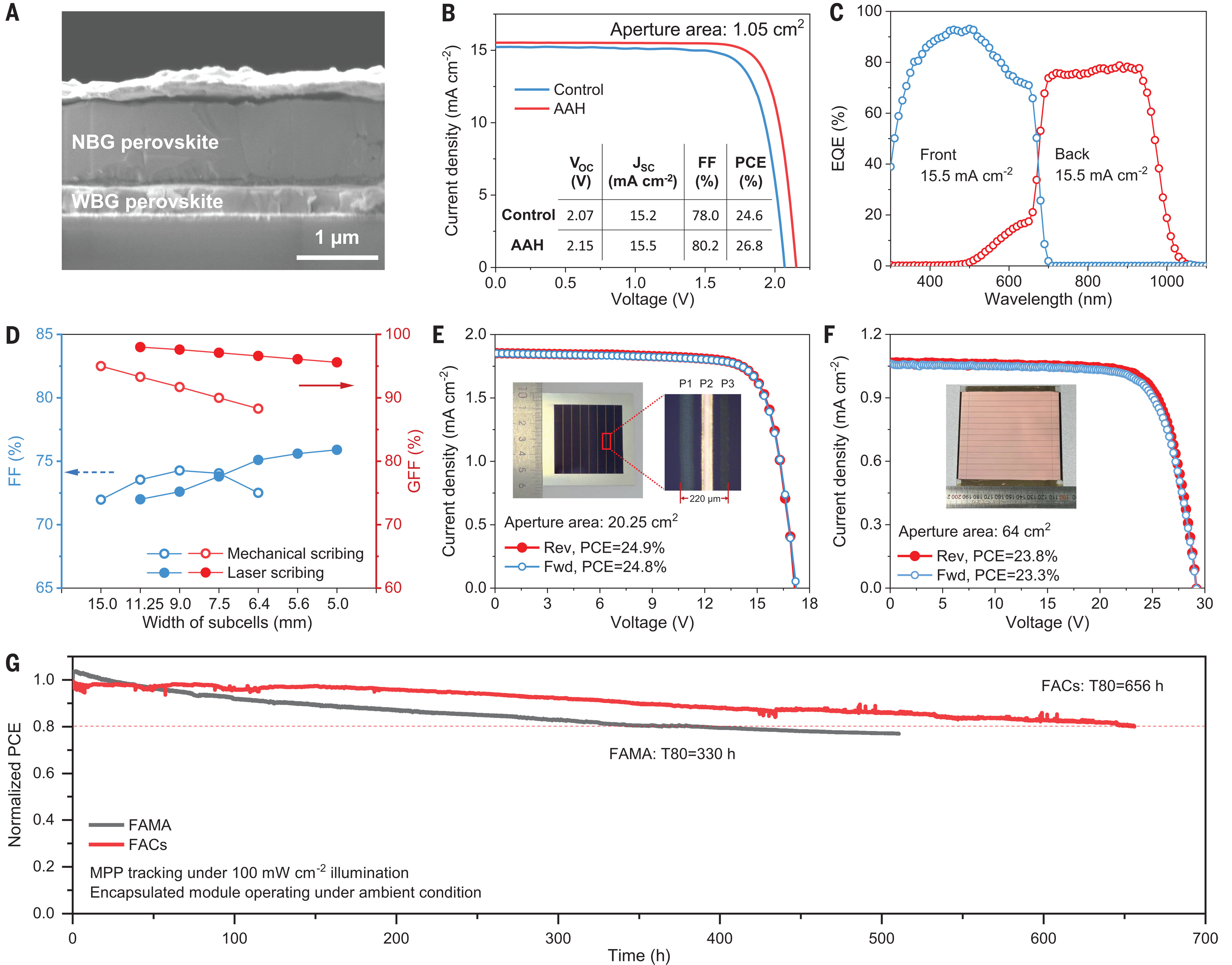 图4. 全钙钛矿串联太阳能电池和组件的光伏性能。© 2024 AAAS
