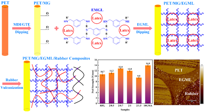 使用封闭异氰酸酯和环氧树脂对PET进行预处理以活化纤维,并结合乙二醇二缩水甘油醚(EGDE)/甲基丙烯酸缩水甘油酯(GMA)/间苯二甲胺(MXDA)/丁吡胶乳(VP)新型环保纤维浸渍涂层以提高橡胶复合材料的界面粘合性能。