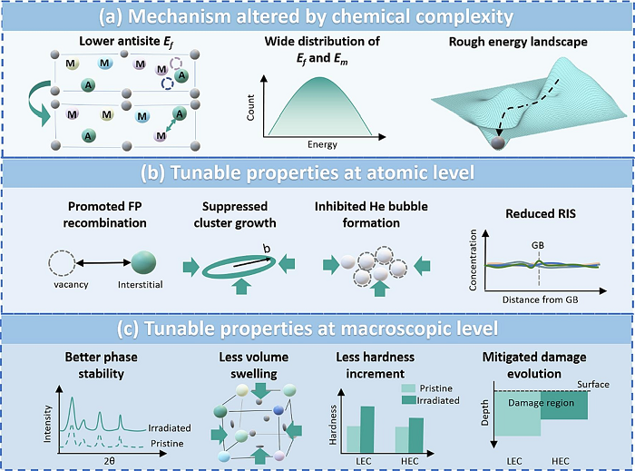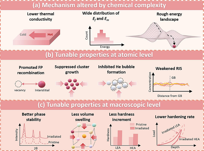 图3:化学复杂性对高熵合金抗辐照性能提升的有益影响归纳:(a) 化学复杂性带来更低的热导率、更广泛分布的缺陷形成能与迁移能,以及更为粗糙的势能面。(b) 在原子层面,这些因素共同促进了缺陷的复合,有效抑制了团簇的生长和氦泡的形成,减轻了辐照诱导的偏聚现象。(c) 在宏观尺度上,这些原子级的现象最终促使高熵合金在辐照环境下展现出更高的相稳定性、较小的体积膨胀、降低的硬度增幅以及减缓的硬化速率。