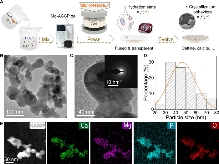 图1. Mg-ACCP无机矿物凝胶的形貌表征。(A) 从盐水到生物陶瓷的示意图:稳定的无定形凝胶在压力作用下的融合,以及对水合和晶化的控制。(B-C) 透射电子显微镜图像,其中(C) 中的插图显示了选定区域电子衍射(SAED)图案。(D) 颗粒大小分布。E) 高分辨透射电子显微镜图像和钙、镁、磷和氧的元素分布图。