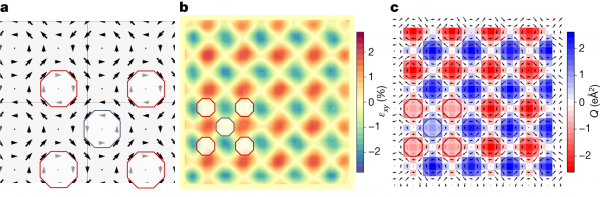 纳米尺度下的铁电性一般取决于对在表面或界面上形成的极化束缚电荷和去极化场的补偿。在纳米铁电体中发现的复杂极性拓扑结构是由于材料发展均匀极化的内在趋势与施加在样品上的电和机械边界条件之间的微妙平衡。铁电介质界面是一种模型系统,其中极化卷曲源于开路样电学边界条件,以避免极化电荷的积累,通过形成通量闭合畴,在纳米级水平上演变成涡状结构。虽然已知铁电性与应变(均匀和非均匀)强耦合,但由于可通过实验实现的应变模式相对较少,因此机械约束对薄膜纳米级铁电性的影响的研究相对较少。最近,J. Santamaria教授带领的研究团队在展示了具有控制扭转角的独立铁电钙钛矿层的堆叠,以一种由与扭转相关的侧向应变调制决定的方式来定制这些拓扑纳米结构。此外还发现极化与应变梯度的挠性电耦合产生了一种特殊的极化涡和反涡模式,为创造二维高密度涡旋晶体提供了机会,从而能够探索以前未知的物理效应和功能。