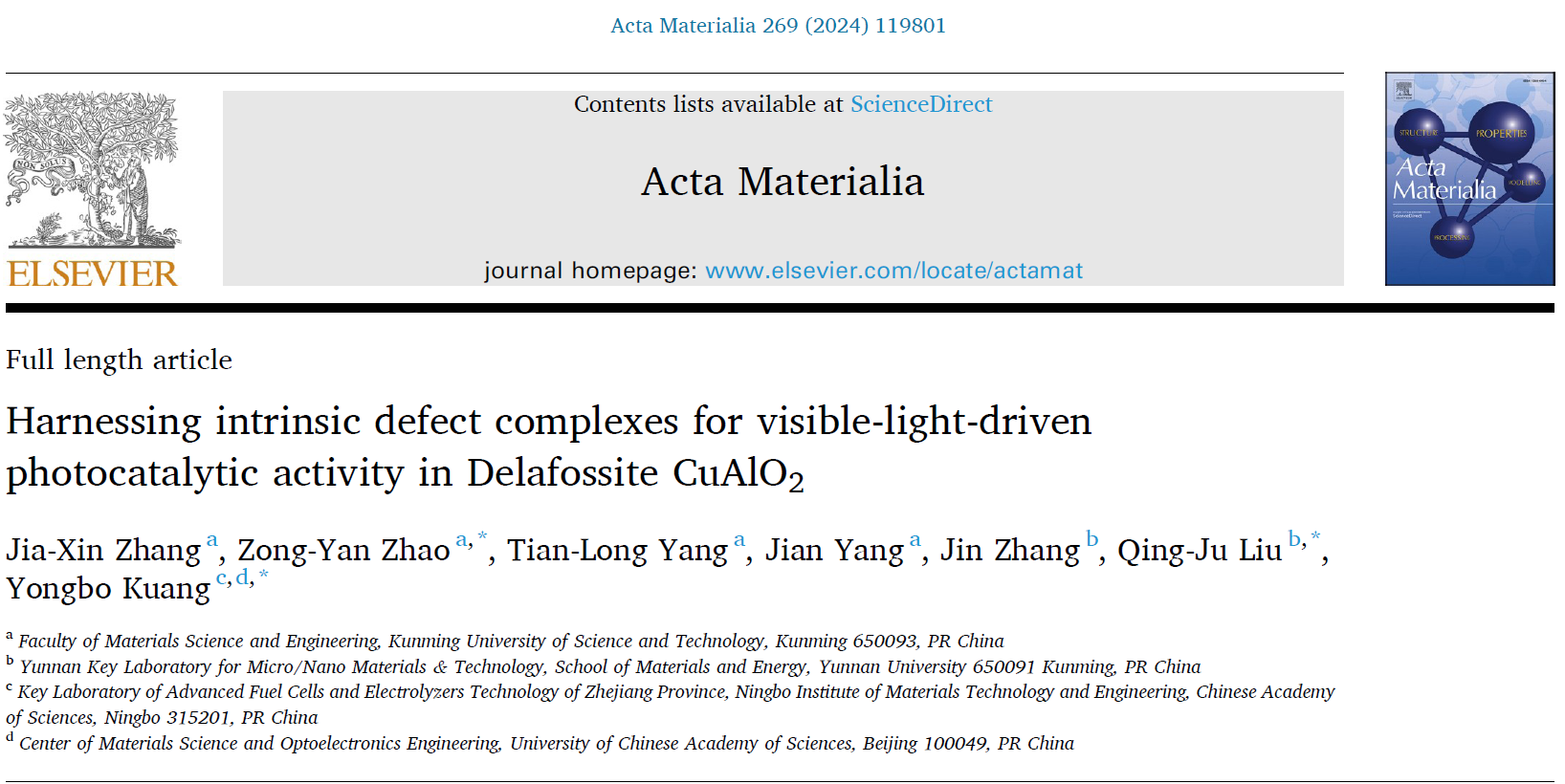 Harnessing intrinsic defect complexes for visible-light-driven photocatalytic activity in Delafossite CuAlO2, Acta Materialia, 2024, 269, 119801.