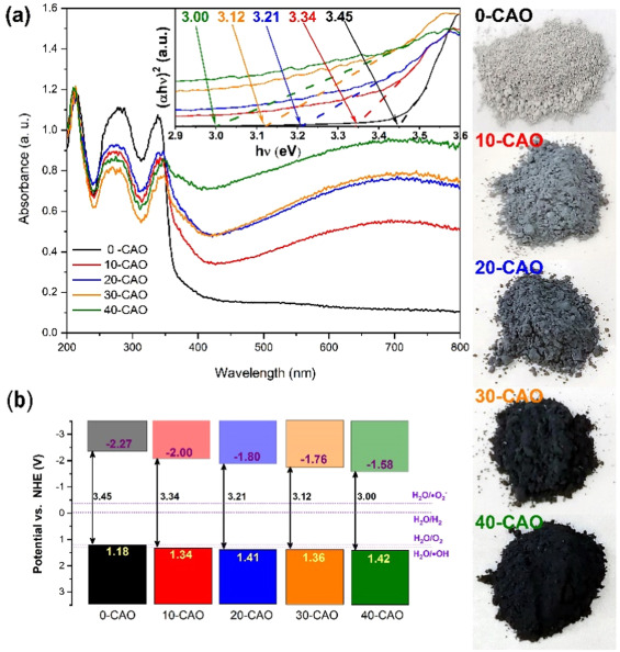 图2、含有不同比例本征复合缺陷的CuAlO2样品的(a)紫外-可见漫反射吸收光谱和(b)能带位置示意图。右图展示的是所制备CuAlO2样品的实物照片。