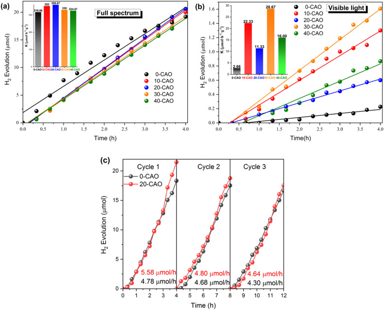 图3、所制备的CuAlO2样品的光催化分解水的析氢速率:(a)全光谱照射,(b)可见光照射下,(c)在全光谱照射的三轮循环测试。